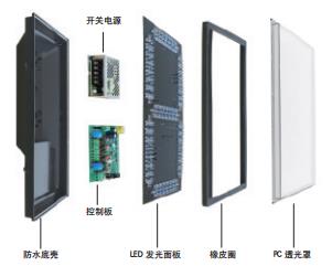 顯示單元由防水底殼、PC透光罩、橡皮圈、LED發光面板、控制板、開關電源、密封條等組成,單元密封性好,密封表面平整外殼采用工程塑料一次性注塑成型。